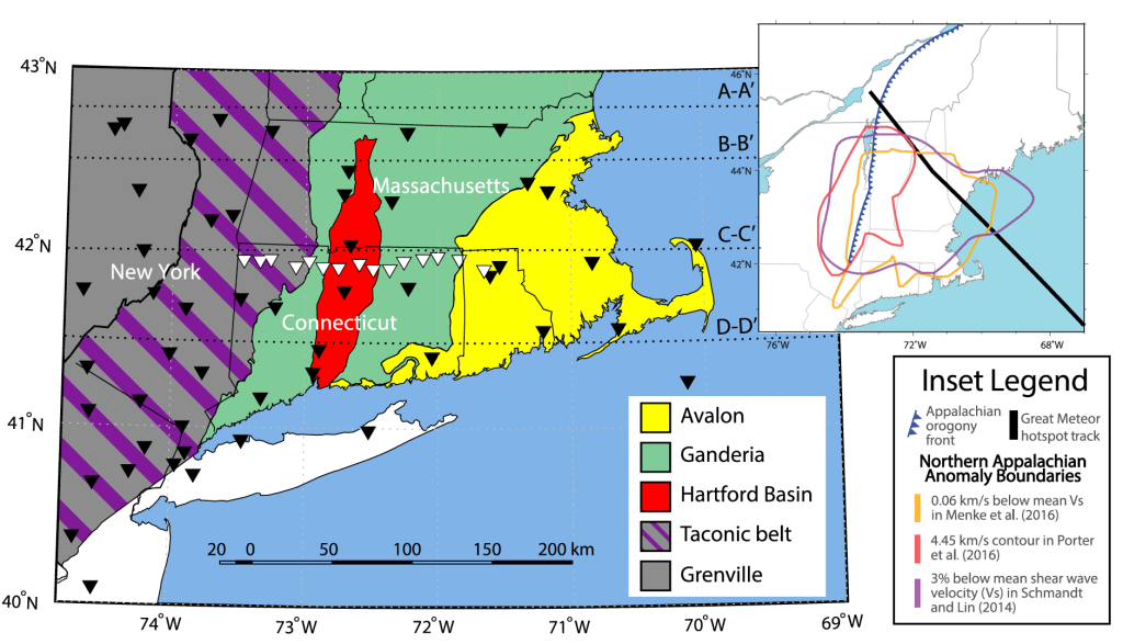 Another focus of my research is on understanding how lithosphere is tectonically or geodynamically modified in regions aside from cratons, and to what extent these modifications can persist through time. Work in southern New England finds that lithospheric properties inherited in past tectonic episodes can persist through several Wilson cycles and may even impact how later modification is accommodated. This work was authored by my former PhD student, Gillian Goldhagen (Goldhagen et al., 2022). The results of Long et al. (2017) largely echo that of Gillian’s work, finding a seismic signature related to ancient orogenesis within the eastern United States. The idea that the mantle lithosphere can retain structure over millions and even billions of years runs counter to the commonly held view that upper mantle properties are best explained by thermal cooling of the lithosphere over time.